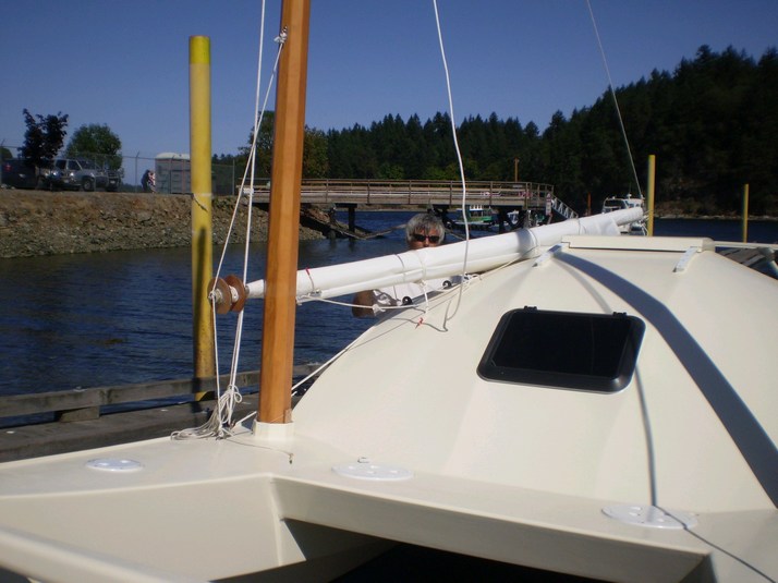 Rigging the starboard boom. I have only finished one sail and as it is blowing 25-30kt that should be enough for a maiden voyage.