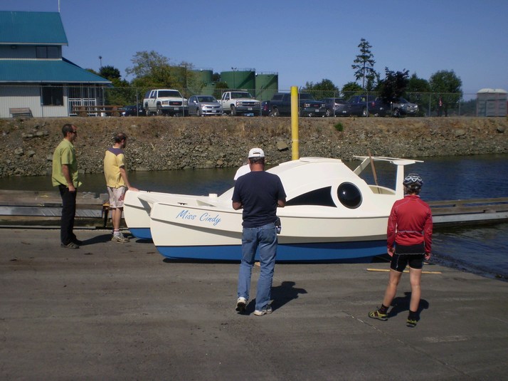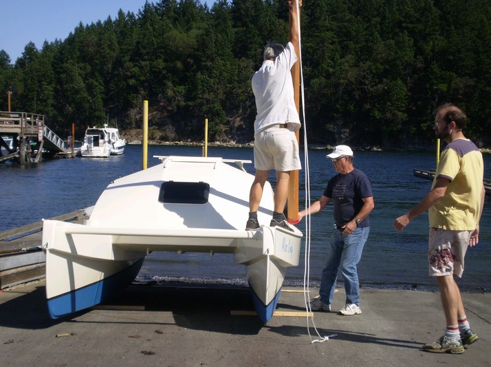 Dave kindly offered the trailer and drove her down to the sea. Thats Iain of 'Loon III' in the army pose ( hands in pockets )