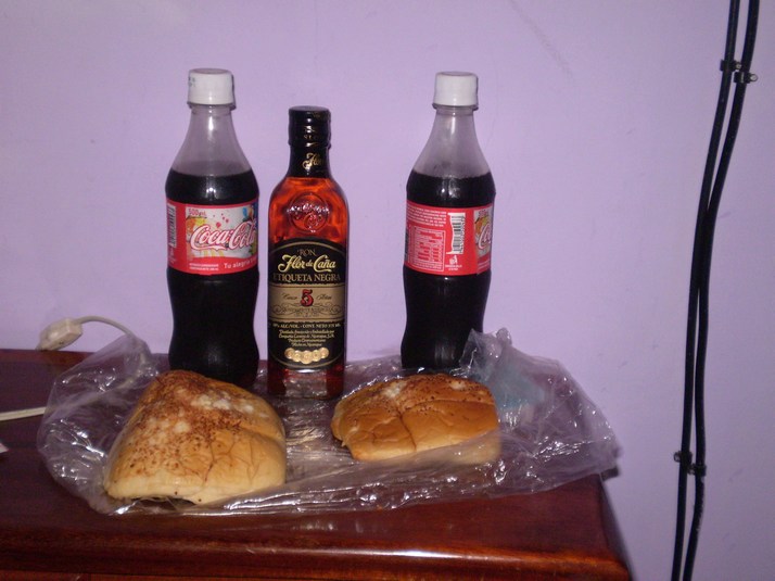 Lunch. Two ham and cheese filled sweet buns with cheese on top $1, two cokes 1$, a half bottle of 5 year old rum $3. Rum is good for a couple of meals:)
