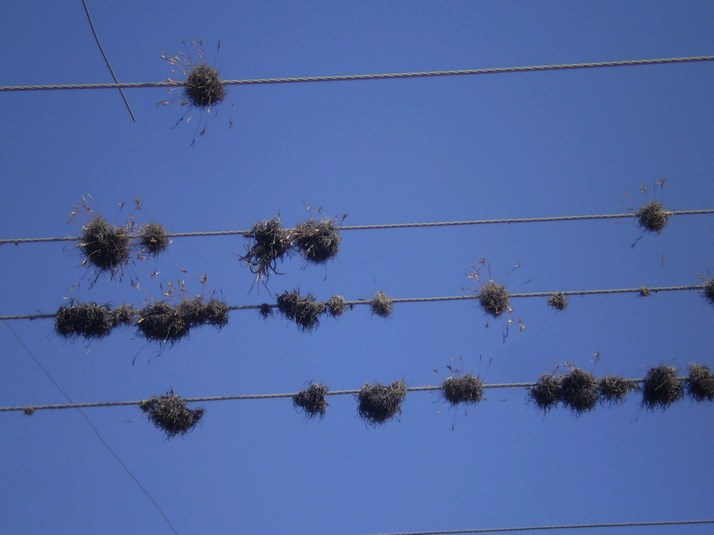 Looks like maybe grass growing out of birds nests, but maybe not. Kinda strange. I have seen some more of these near the marina and now think they may be bromeliads or other air plants of some sort.