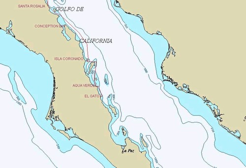 Aeolous has been kind and generous with his winds but he is not done with us yet. At 1000 we are now 2 miles from Isla Coronado. We anchor there 5 1/2 hours later having passed it on our way to Lorreto but the wind continually shifts against us and the current turns. If we work to the East of the channel the wind turns Westerly when we tack back. The wind remains light and the waves confused. We are content to finally anchor at Isla Coronado where we could have anchored at 1100 if only we had known what was in store.