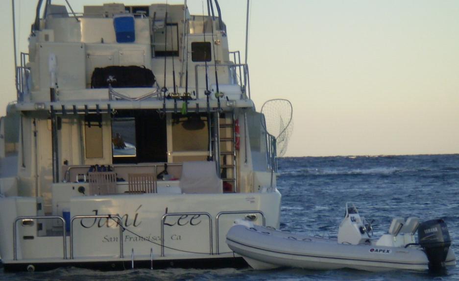The bottom is starting to come up, we are now in less than 50' and the waves are feeling the bottom and getting a bit steeper. The North reef is spuming nicely and I have a nice close course to it. As soon as I clear it I gybe the starboard sail, always interesting in 30kt, but it goes well. There are two big powerboats in the bay so I will have to share. I carry a bit of a luff on the sails and work in close astern of Jani-Lee from San Francisco ( got chewed out for using 'frisco' the other day ). A little surprise awaits as Jani-Lee has a black line headed to a stern anchor to keep her pointed into the swell. I fall off a bit and drop one then the second anchor. It is 1510. We covered 17 nautical miles in two hours 40 minutes hook to hook. I pick up the GPS and our peak speed was 13.9kt. I am pretty sure I recall that moment.