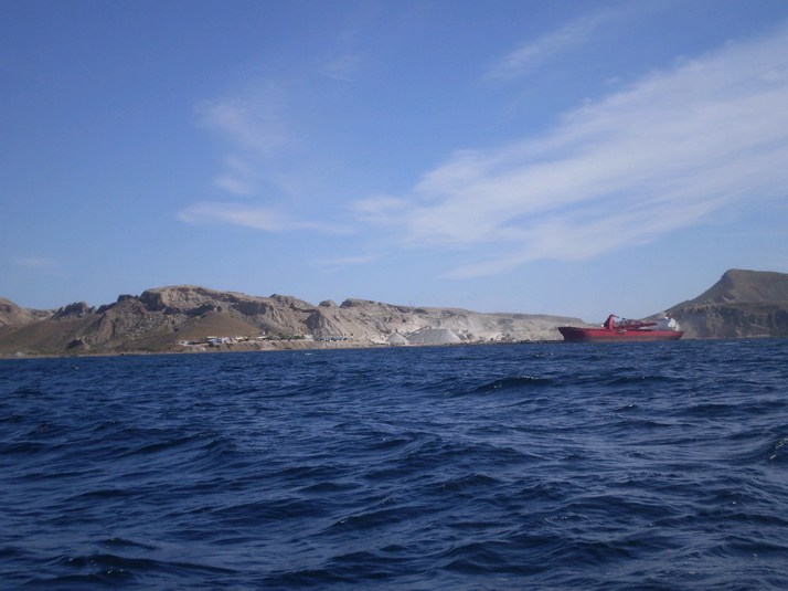 The first 24 hours of this hop were the kind of sailing 'Miss Cindy' and I came here for. Easy breezes, modestly challenging navigation, things to see. A gypsum loading operation with two big ships on Marcos island. A rust bucket shrimper we passed close aboard with friendly waves all round. The ambiguity of Mexican charts, just enough to make life interesting. The sounder shoaling fast as we cross thru 10' of pale green to the deeper dark blue with 2' overfalls at the transition from the current in Curtis Channel. A close reach to the next point where a confluence of waves are trying to burst on our beam and make us wet, but 'Miss Cindy' lifts her skirts, laughs, and swooshes out of the way.