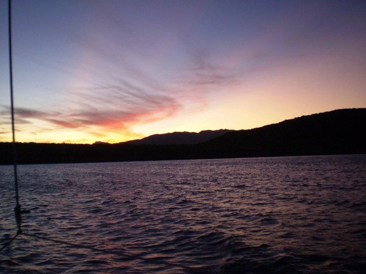 By 1100 we are coasting down the East side of the island with a line out, traveling at good fishing speed of 4-5kt headed to Isla Monserate. I take a couple of naps and during one a fish strikes and takes the rig from the swivel aft. Clearly need to brush up on my fishing knot tying. As the sun goes down the wind dies and we are 10 miles from Aqua Verde. I spend a bit of effort trying to identify the entrance on the far shore.