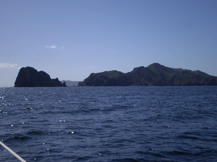 By 1800 the wind is back and we are on a close reach into 25kt with a single reef in. A couple of hours later I think I have identified the entrance. There should be a big pinnacle rock about 1/4 mile away from the point. The moon is full but has been hiding behind the heavy clouds. Around 2030 we are committed and heading into what appears to be the bay. We stay clear of the reef on the West side and drop anchor in the big bight at the head of the bay in 23' of water between a couple boats with anchor lights on.